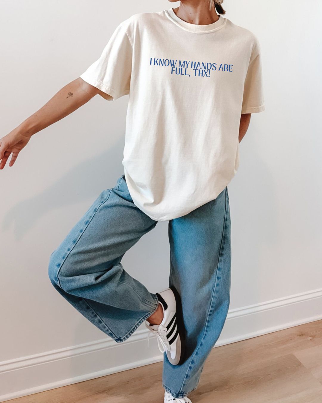 Our I Know My Hands Are Full, Thanks. tee is the perfect playful nod to every “Wow, you’ve got your hands full!” comment you’ve ever received. It’s lighthearted, relatable, and just the right amount of sass — because motherhood is beautiful… and chaotic… and somehow both at the same time.